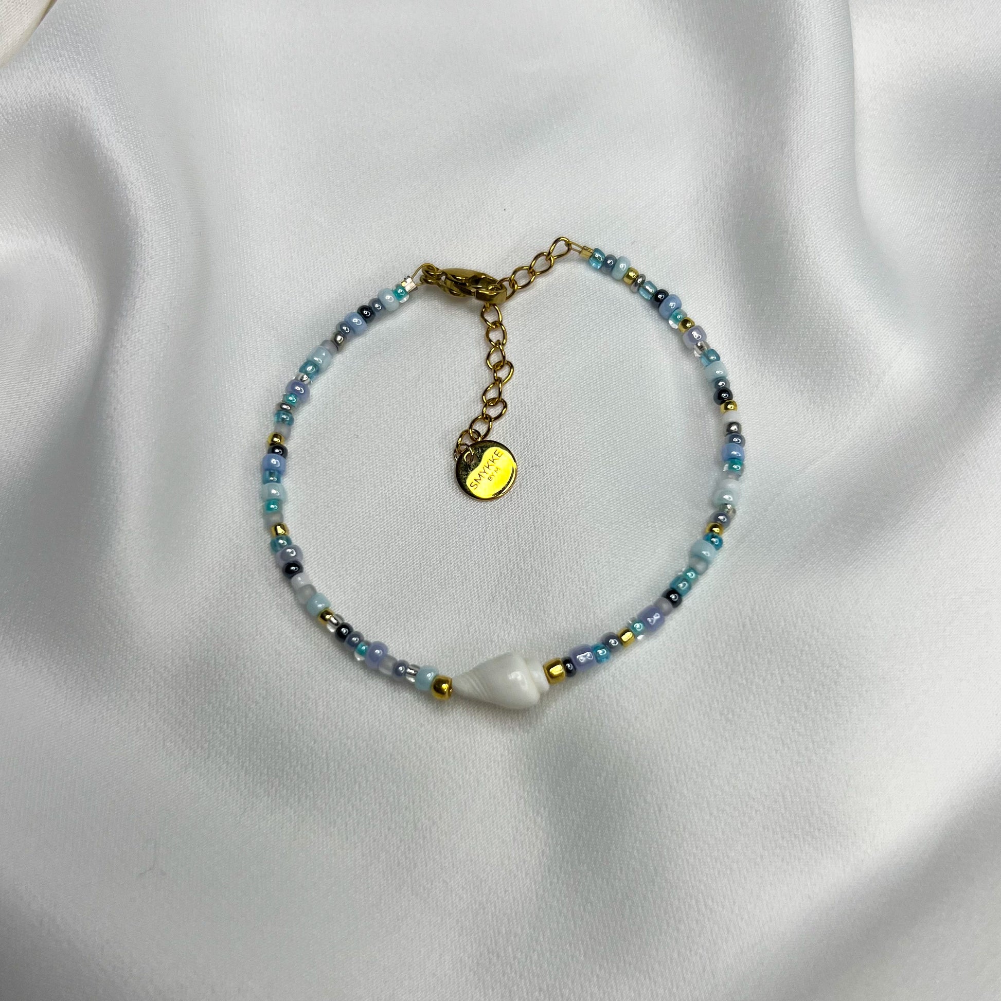 Alba er et håndlaget armbånd med små blåtonede glassperler, gullfargede detaljer og et vakkert skjell i midten. Smykket har et friskt og lett uttrykk som gir assosiasjoner til sjø og sommerdager ved kysten.