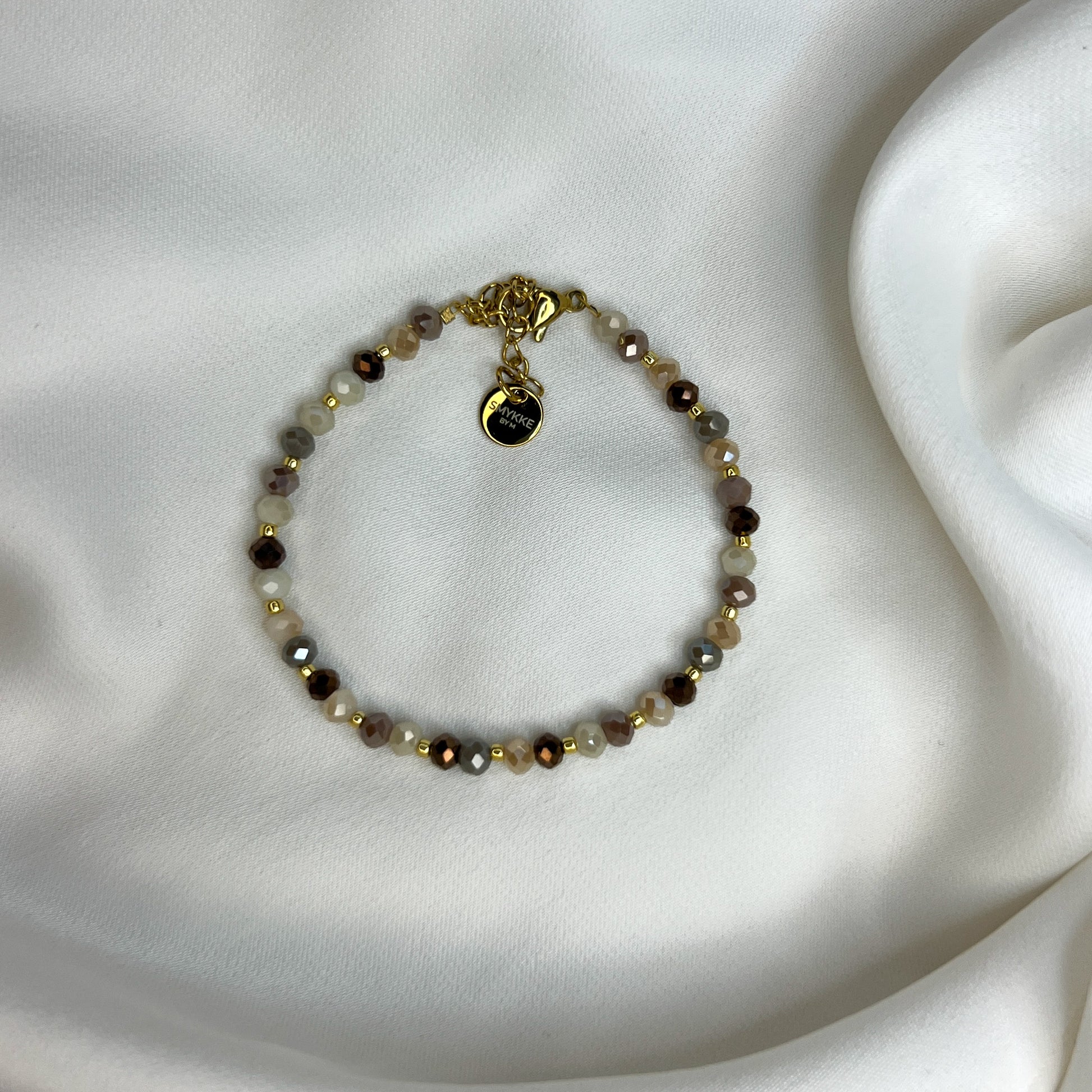 Lena-armbåndet er et elegant og tidløst smykke laget av små, fasetterte glassperler i varme, naturlige toner kombinert med gullfargede perler og materialer i rustfritt stål. Den myke glansen gjør armbåndet perfekt som et hverdagsfavoritt, samtidig som det passer nydelig til finere anledninger.