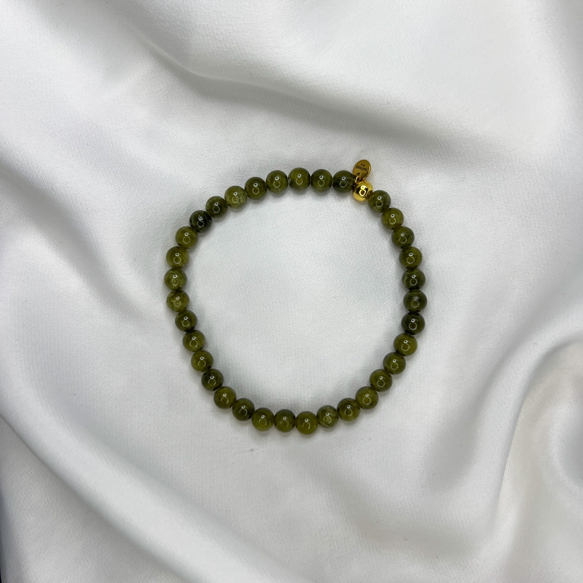 Et stilsikkert herrearmbånd håndlaget med natursteiner i varme grønne toner – et uttrykk av ro, balanse og styrke. De glatte steinperlene er tredd på solid, elastisk tråd som gir behagelig passform og fleksibilitet.