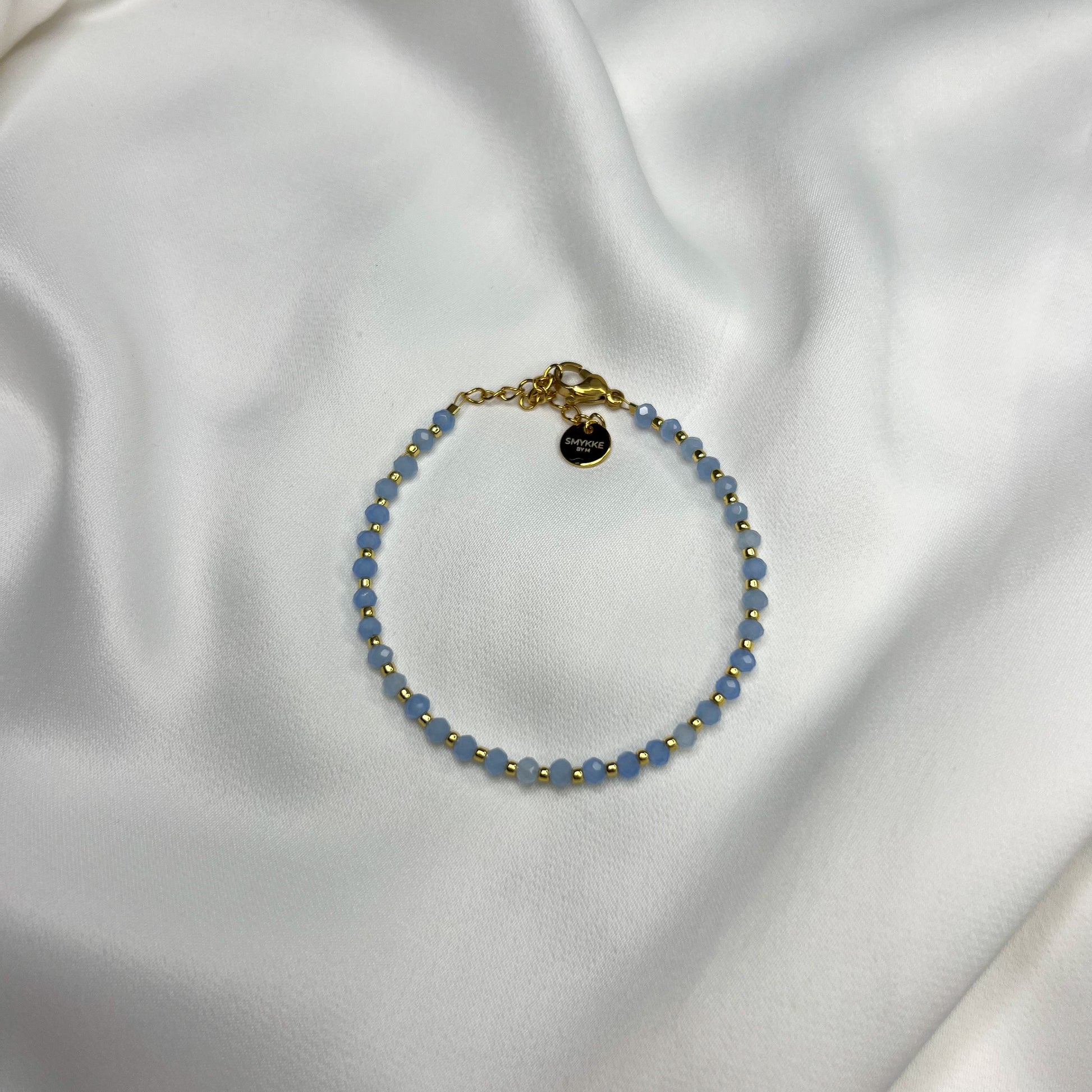 Armbånd med lyseblå fasetterte glassperler, gullfargede perler og gullbelagte materialer i rustfritt stål.