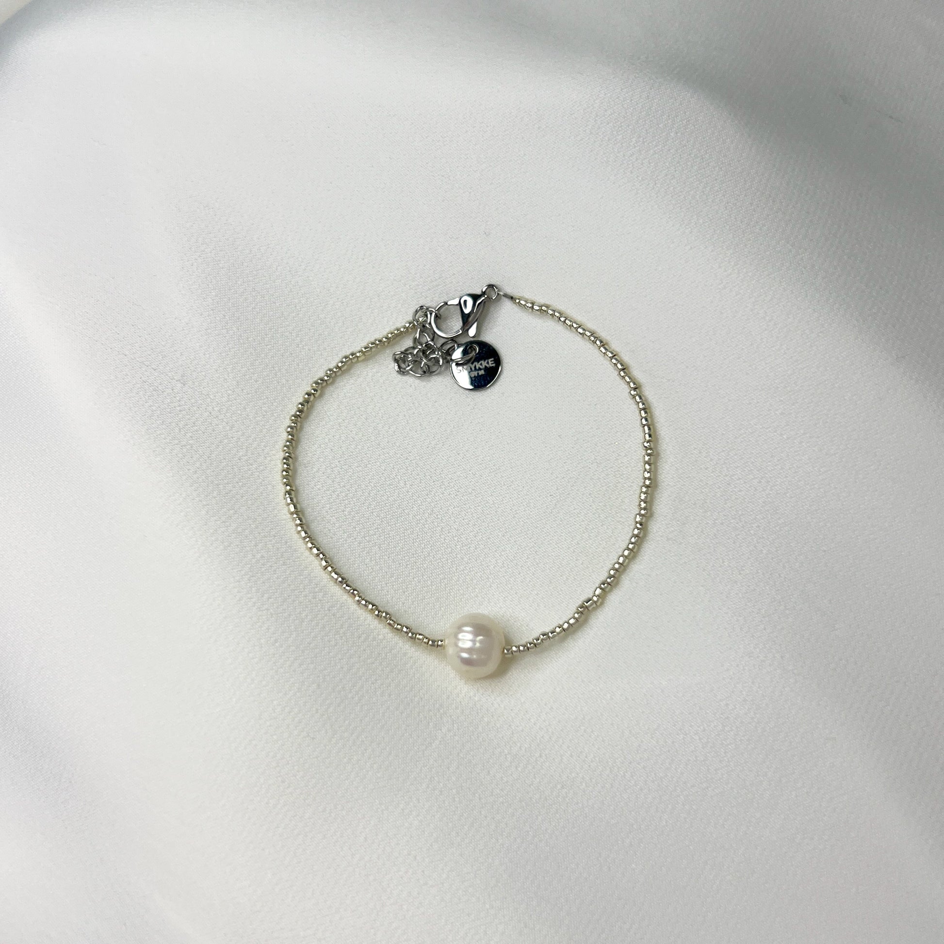 Det håndlagde armbåndet har sølvfargede perler, ekte ferskvannsperle og sølvbelagt messinglås og lenke.