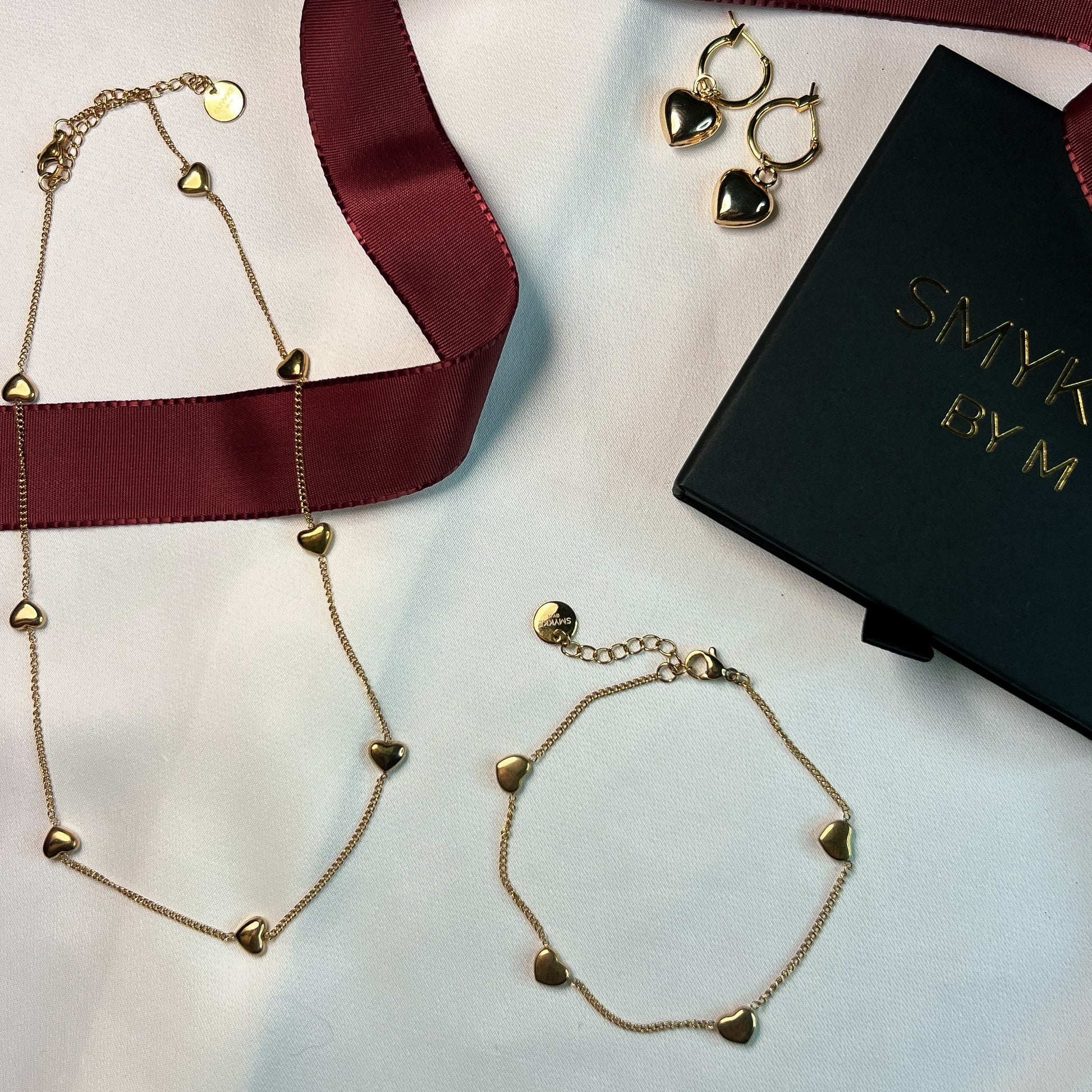 Sjekk ut dette fantastiske settet med både øredobber, halskjede og armbånd i gullforgylt rustfritt stål med hjerter! En perfekt gave til en du er glad i eller til deg selv!