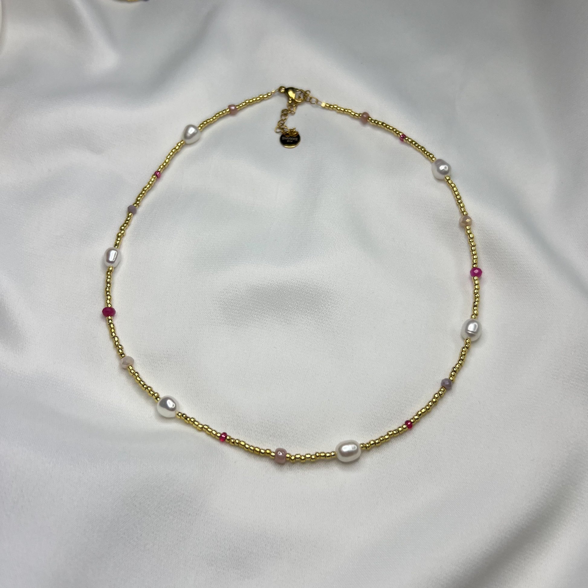 ✨ Materiale: gullfargede glassperler, rosa perler, ekte ferskvannsperler, detaljer i rustfritt stål