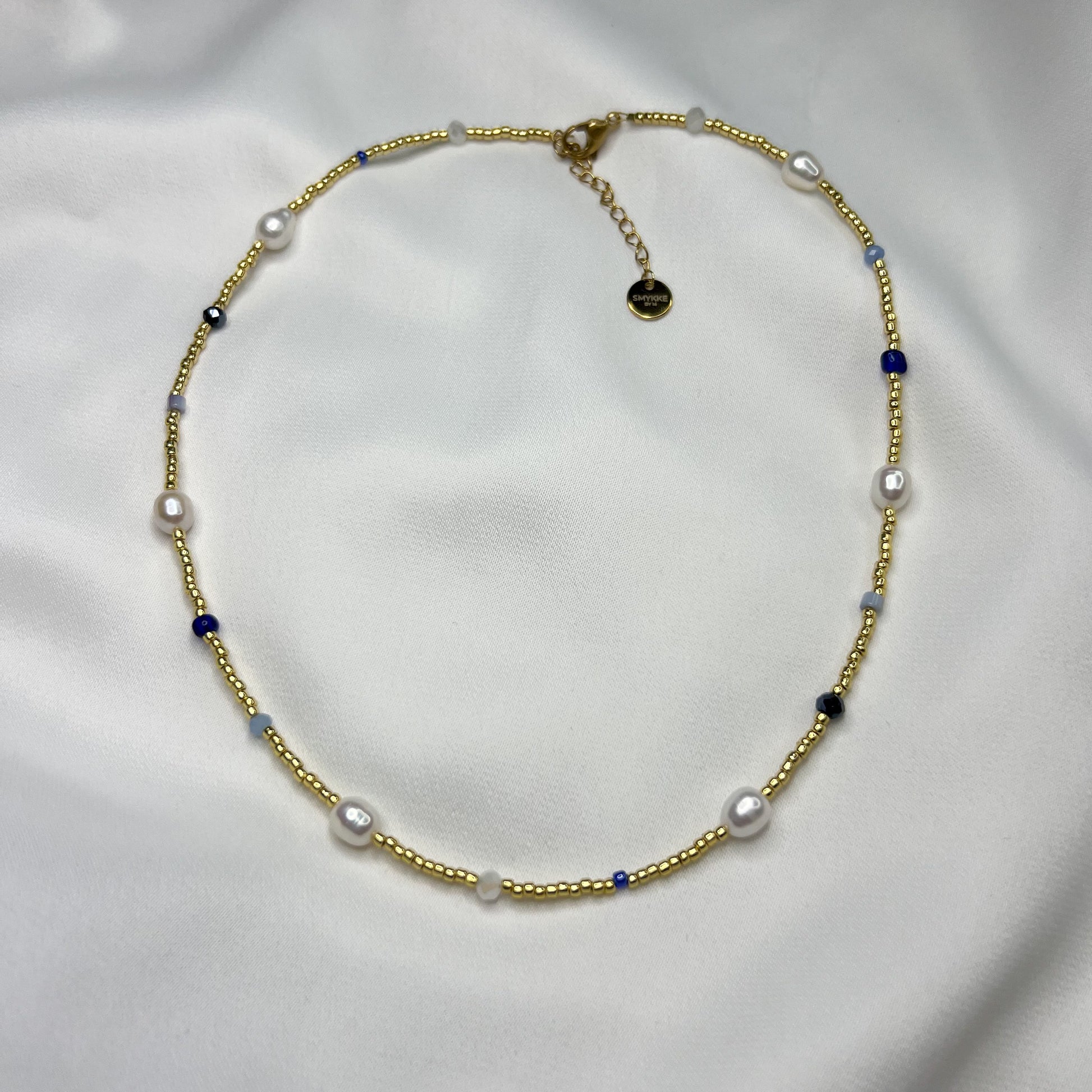 ✨ Materiale: gullfargede glassperler, blå perler, ekte ferskvannsperler, detaljer i rustfritt stål