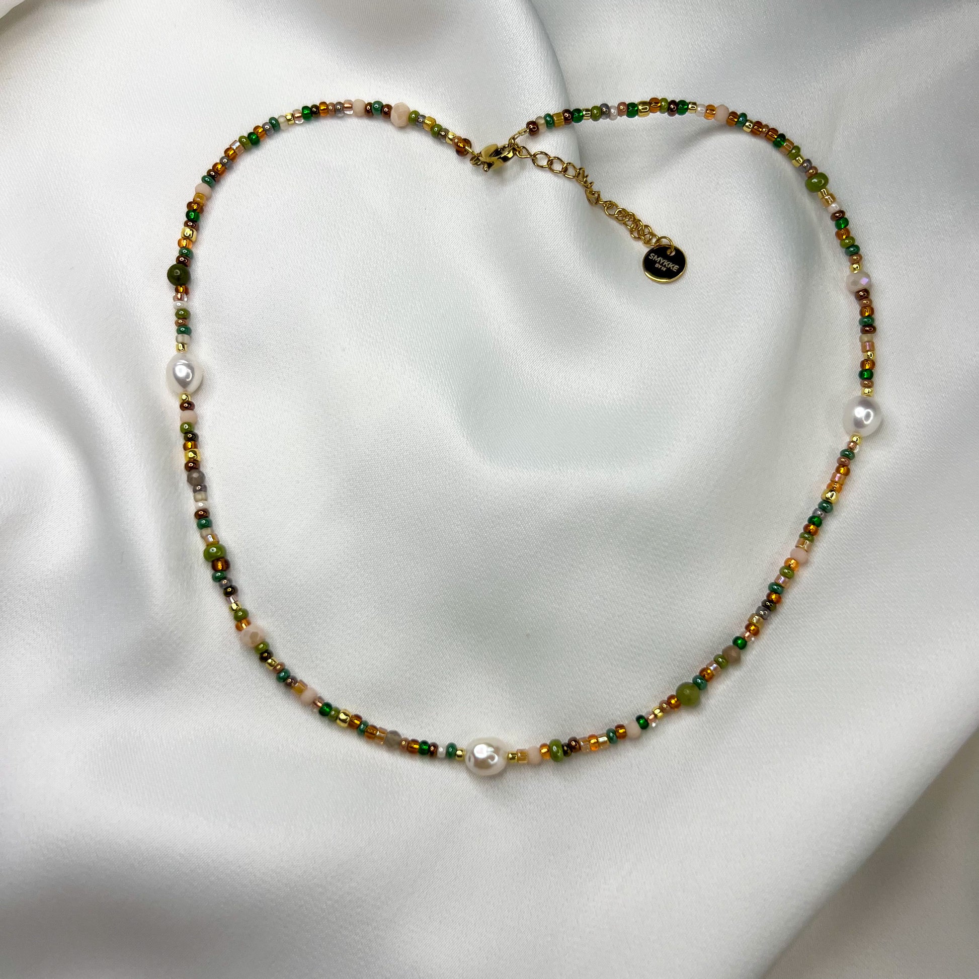 Selma er et håndlaget halskjede med en vakker miks av ekte ferskvannsperler, små perler i grønne og gyldne toner, og gullfargede glassperler. Fargene gir smykket et lunt preg – perfekt til høstens antrekk.