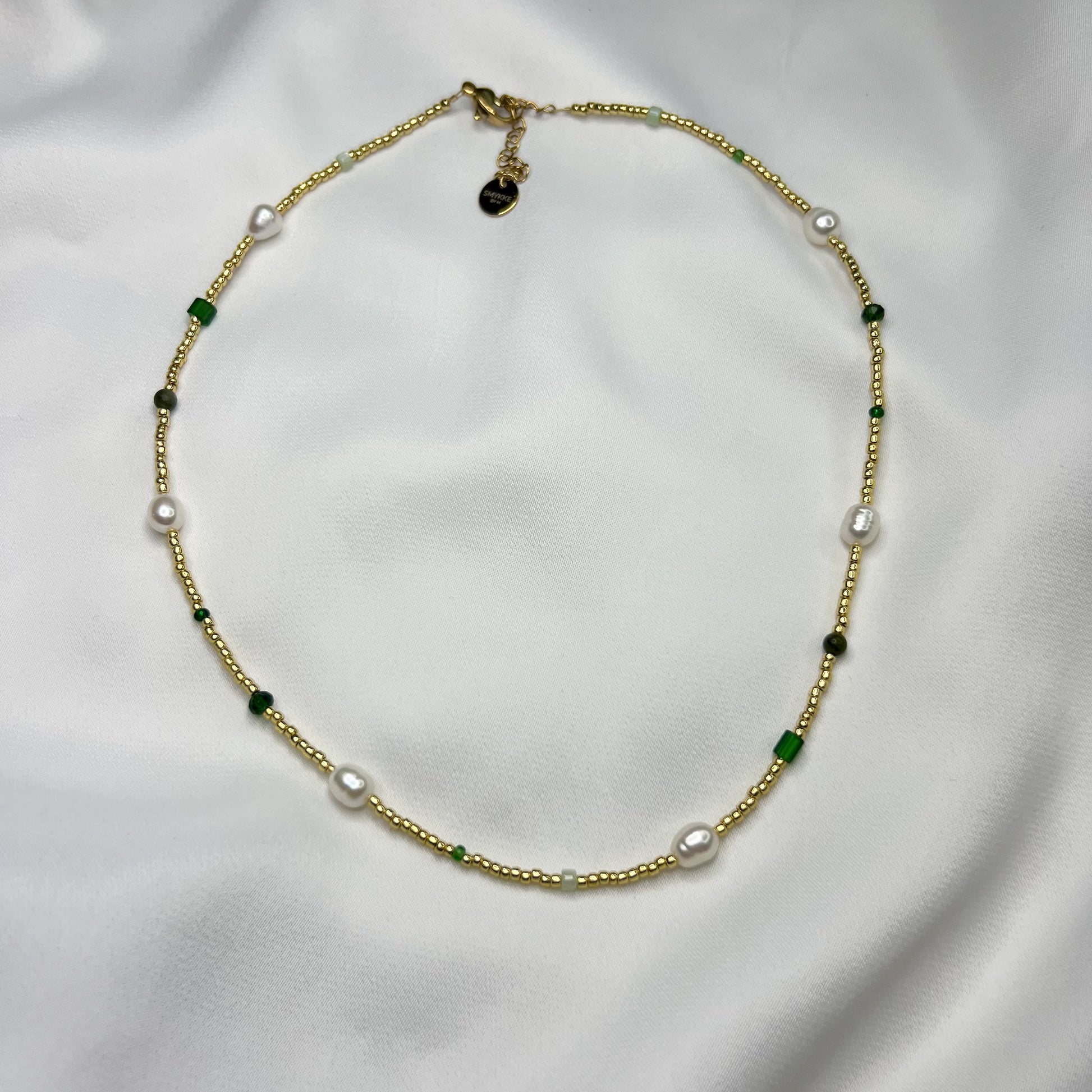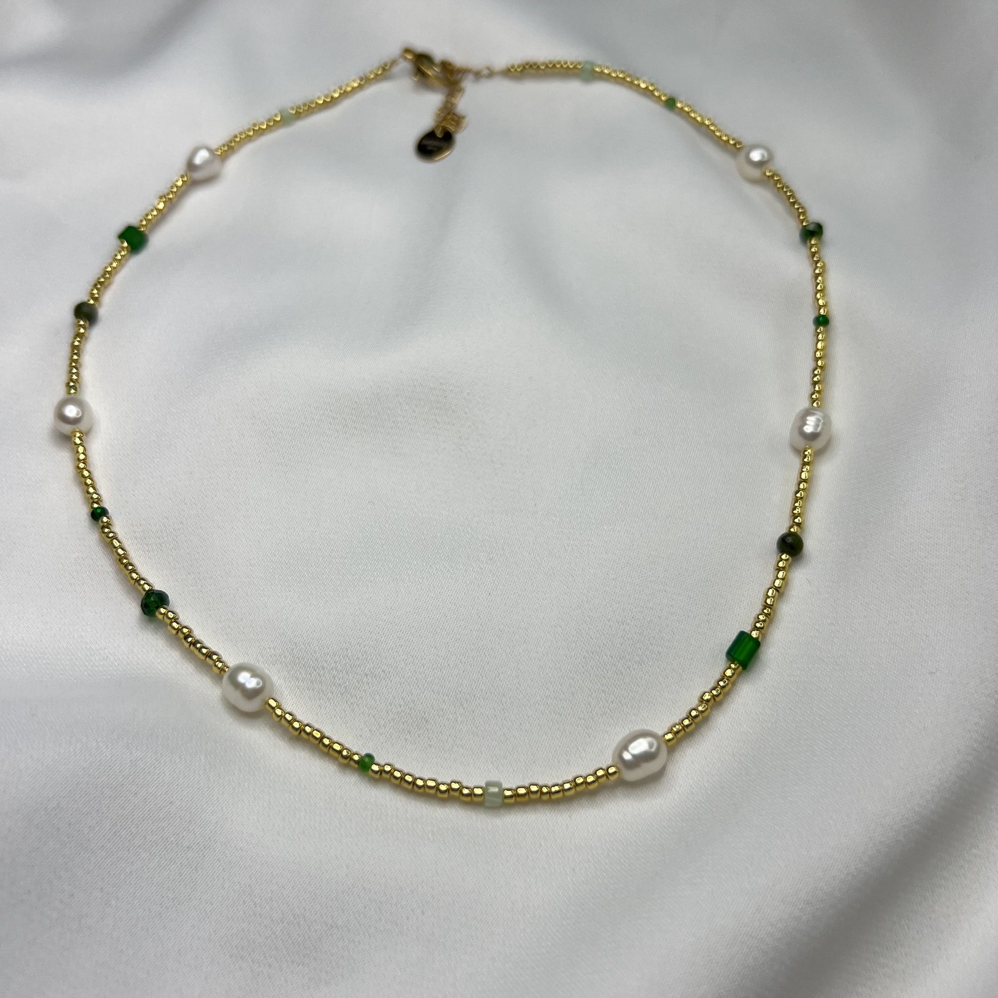 ✨ Materiale: gullfargede glassperler, grønne perler, ekte ferskvannsperler, detaljer i rustfritt stål