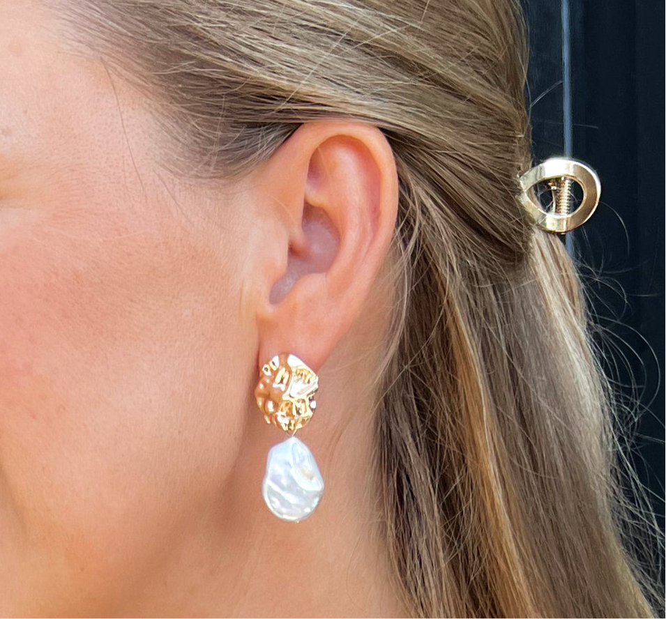Øredobber i 14k gullbelagt messing med ekte ferskvannsperle i dråpeform. Ørepynten er et statement smykke som kan pynte opp ethvert antrekk og som kan brukes til mange anledninger, både til hverdags, fest, bryllup og ikke minst sommerens fineste kjoler. Bli festens blikkfang!