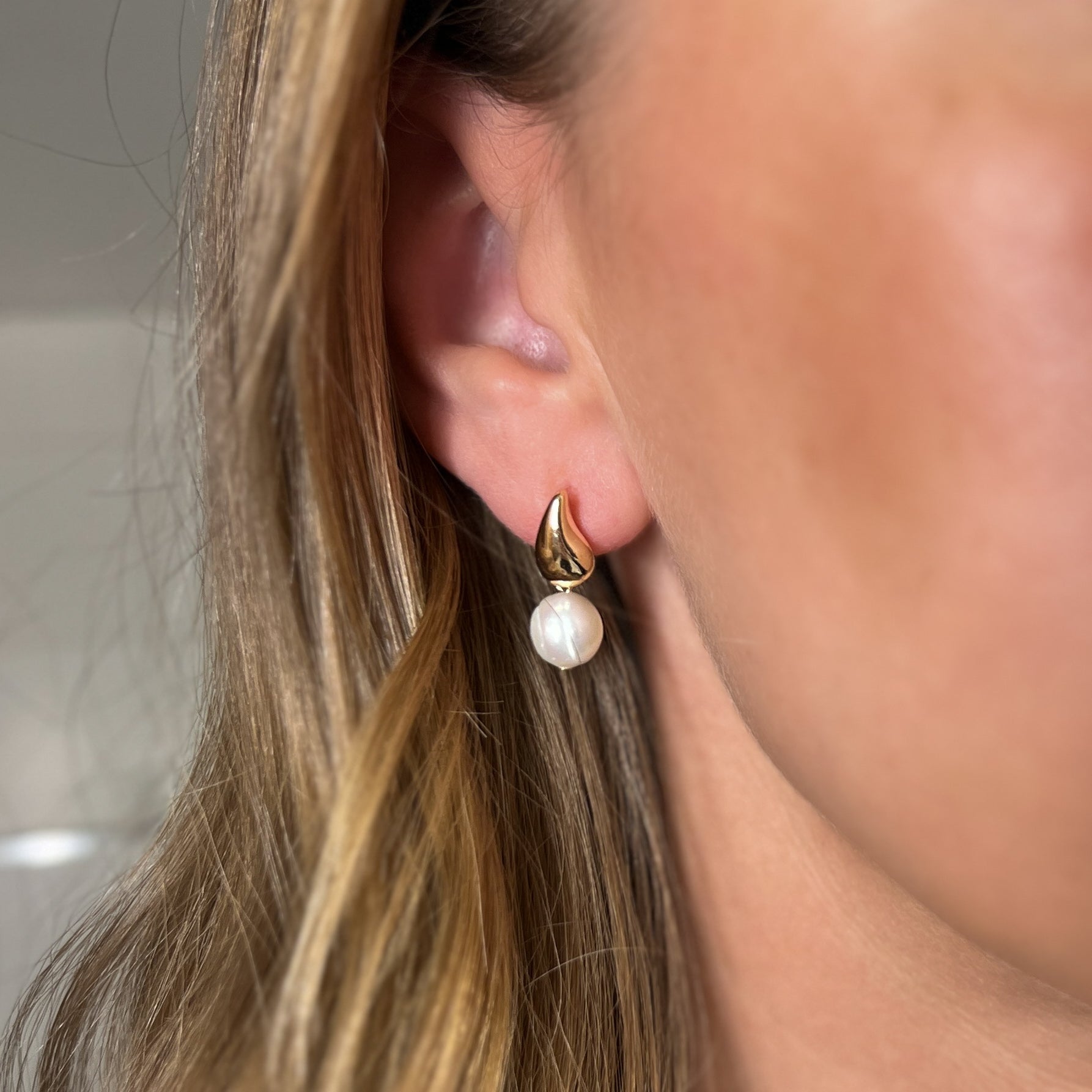 Perlefall er et par tidløse og feminine øredobber laget i nikkelfri 14k gullforgylt messing. Den rene, elegante dråpeformen i gull kombineres med en rund ferskvannsperle som faller mykt og vakkert under øret.