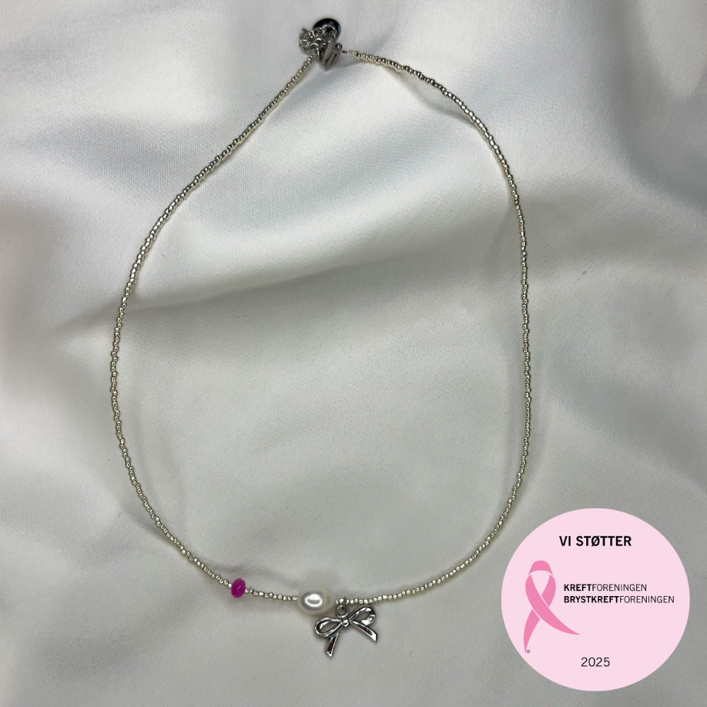 Bli med å støtt Rosa sløyfe-aksjonen – når du kjøper dette halskjedet, donerer Smykke By M 50 kr direkte til aksjonen.