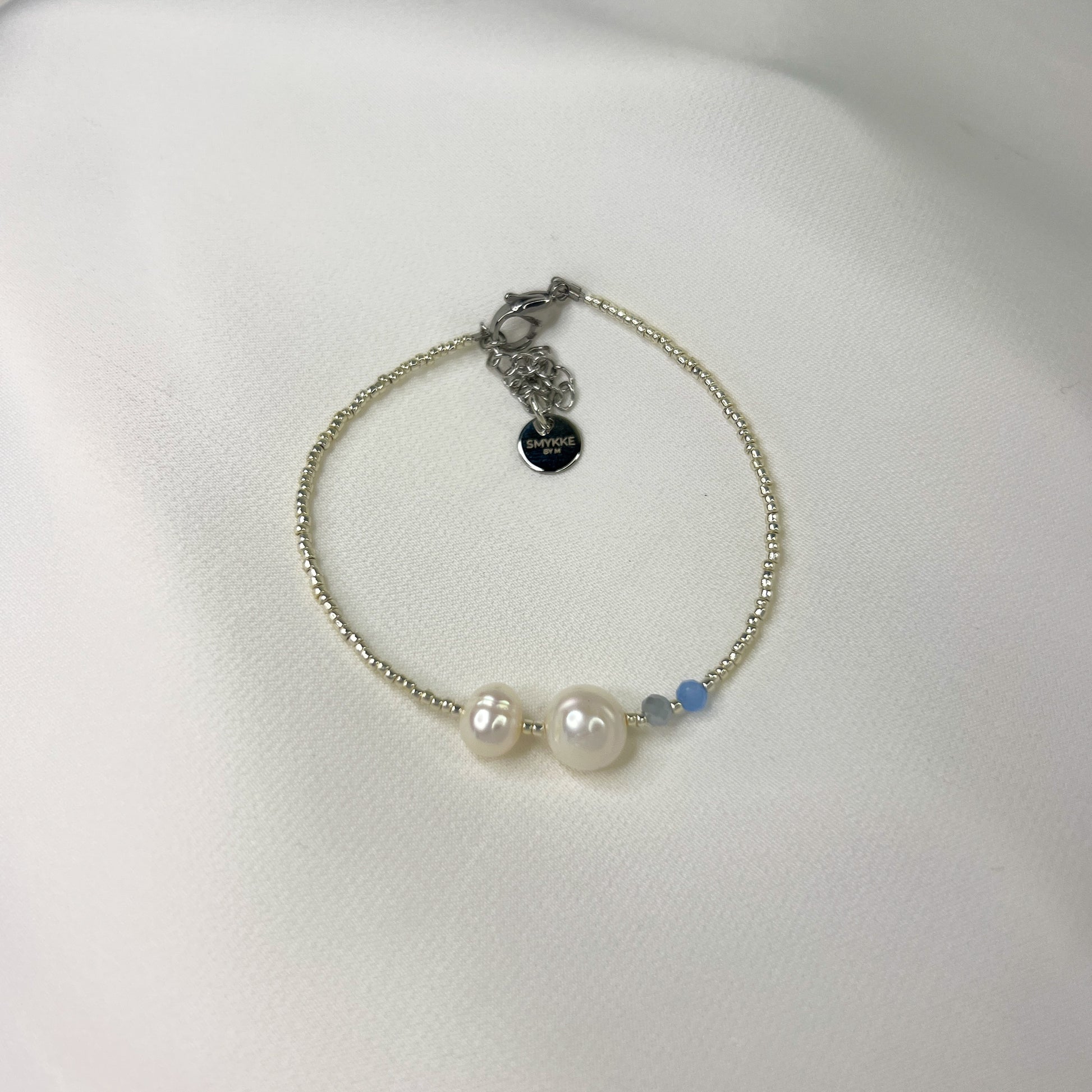 Armbånd med blå glassperler, ferskvannsperler, sølvfargede toho perler og materialer i rustfritt stål.